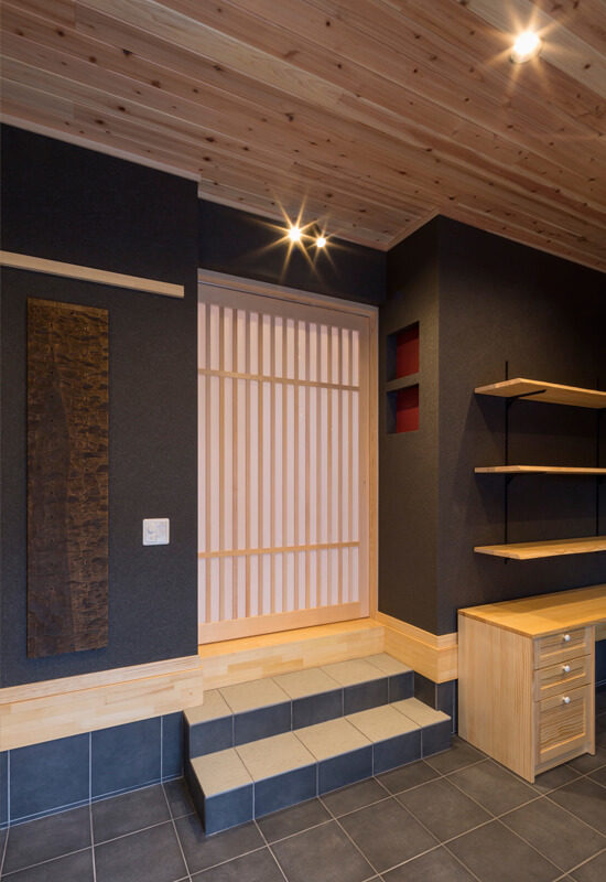 ご家族が経営する米屋と住まいが一緒になった店舗併用住宅。和の趣とモダンな雰囲気が特徴的な外観が人々を迎えます。おしゃれな店舗の玄関は、赤系の塗装を施した格子戸が美しい景観の意匠要素になっています。ご主人こだわりのダークな色合いの壁紙を採用したモダンな店舗部分。淡い色合いの無垢材の建具が空間をさらに引き立たせています。