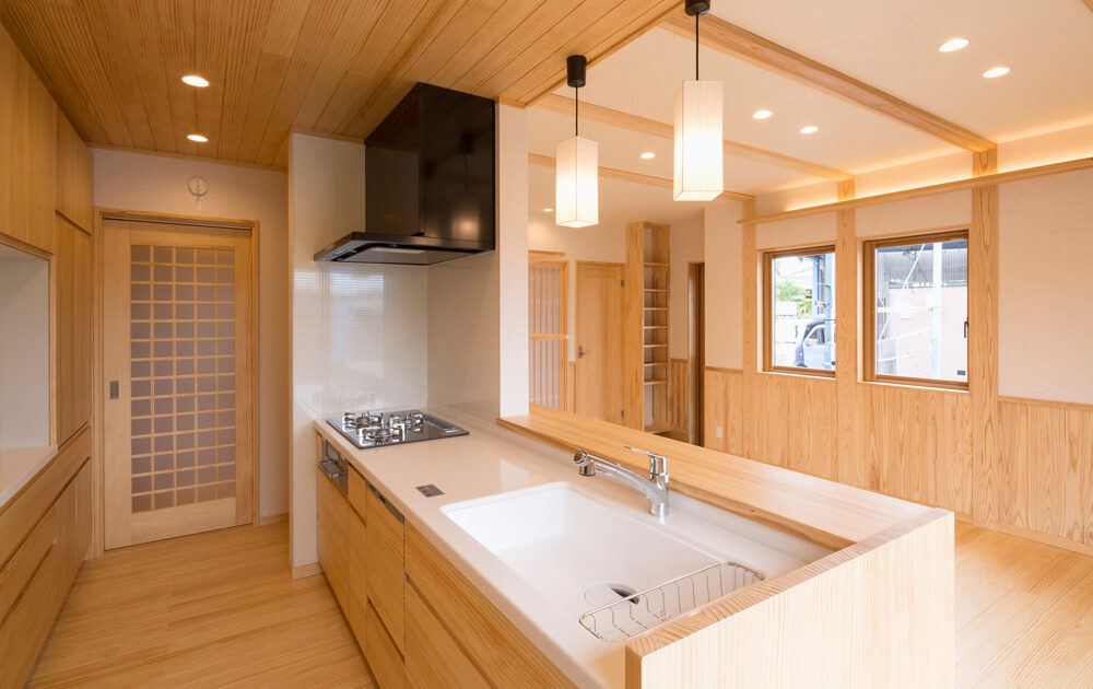 住居部分は、木のぬくもりを存分に感じられるように、床・腰板・キッチン・建具まで無垢材をふんだんに使い、時を重ねるごとに美しい風合いに変化していく無垢材の味を楽しめます。天井も板張りで自然素材に包まれた癒しのキッチンはWOODONE製。窮屈さを感じることなく楽しく料理ができる場所になっています。